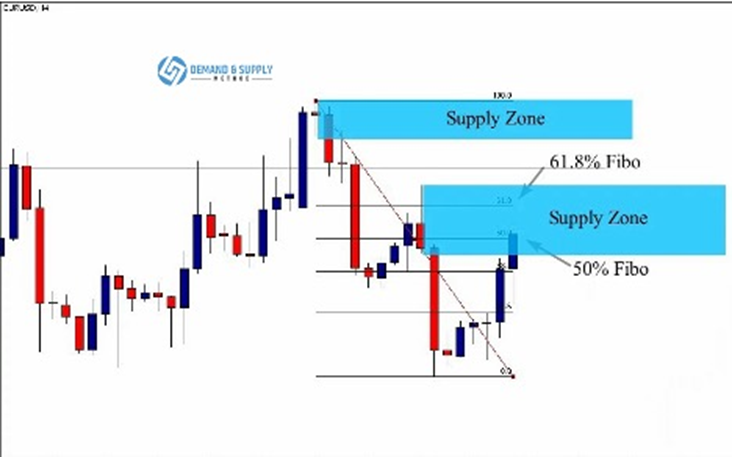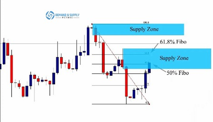 In the chart, you can see two important supply zones that have formed. These zones indicate where banks and financial institutions have placed their orders and where the market is likely to reverse. Now, let’s apply the Fibonacci retracement tool to this chart to identify the 61.8% and 50% levels.