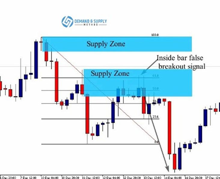 However, since it’s uncertain whether the market will continue rising to test the first supply zone, a confirmation pattern is necessary before deciding to trade. In this case, an inside bar false breakout pattern signaled a likely downward move.