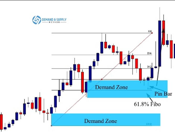 In the chart with Fibonacci retracement levels applied, the second demand zone aligns with the 61.8% Fibonacci retracement level, making it a significant zone to watch. When the market approaches this zone, a confirming candlestick pattern, such as a bullish reversal, should be sought before entering a trade.